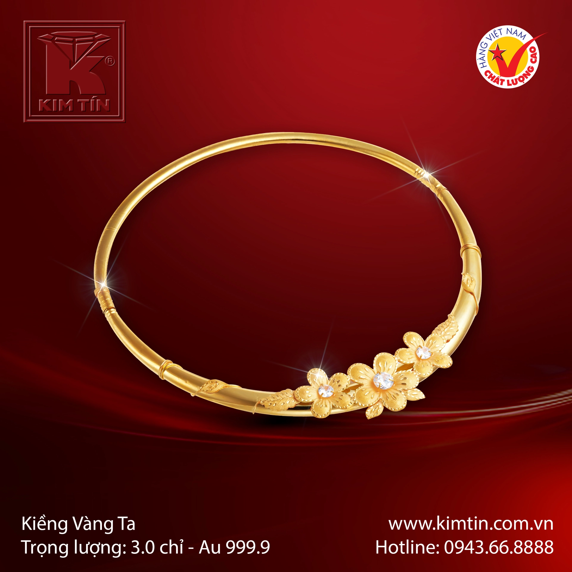 Chiếc kiềng vàng ta 24K được chế tác từ 3 chỉ vàng nguyên chất (Au 999.9), mang đến vẻ đẹp thuần khiết, sáng bóng và giá trị vĩnh cửu.